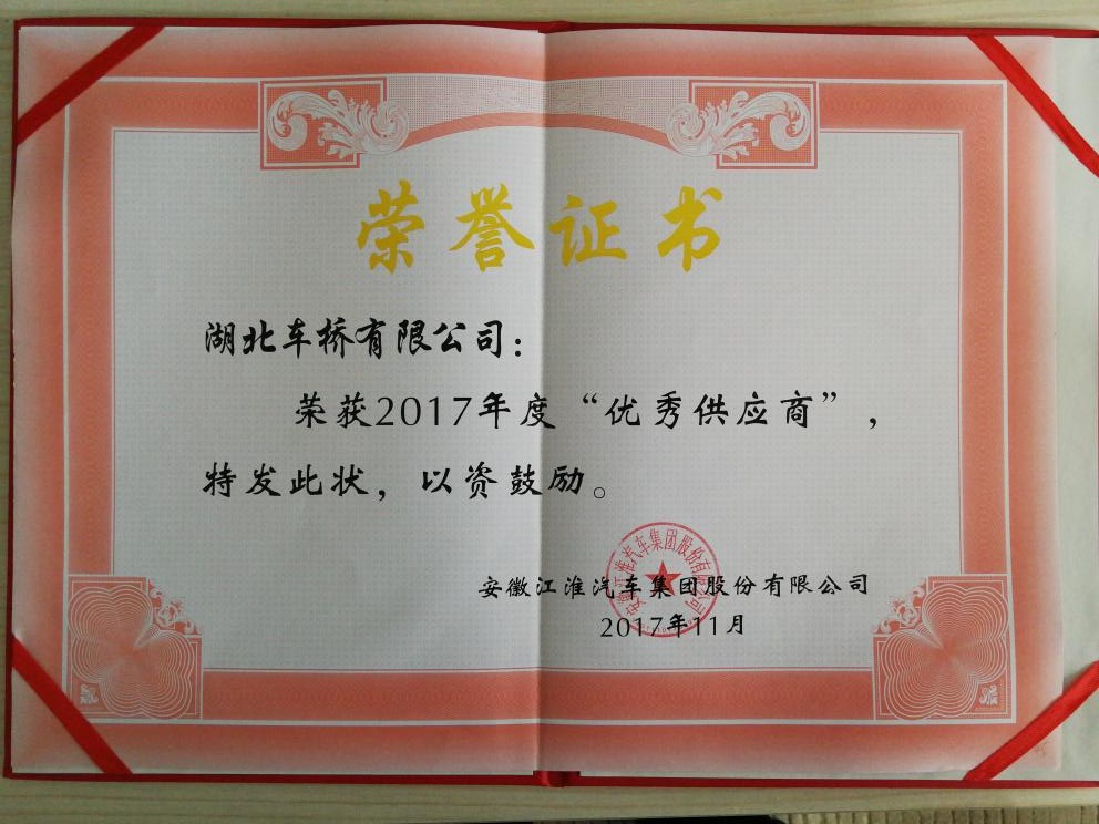 首頁 ? 新聞動(dòng)態(tài) ? 喜訊:熱烈慶祝湖北車橋有限公司榮獲安徽江淮汽車集團(tuán)股份有限公司2017年年度優(yōu)秀供應(yīng)商發(fā)布時(shí)間:2017-11-18