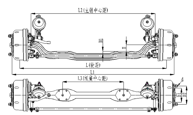 1.前軸為整體鍛造結(jié)構(gòu),加強設(shè)計,承載能力強;2.輪距、板簧距可靈活調(diào)整